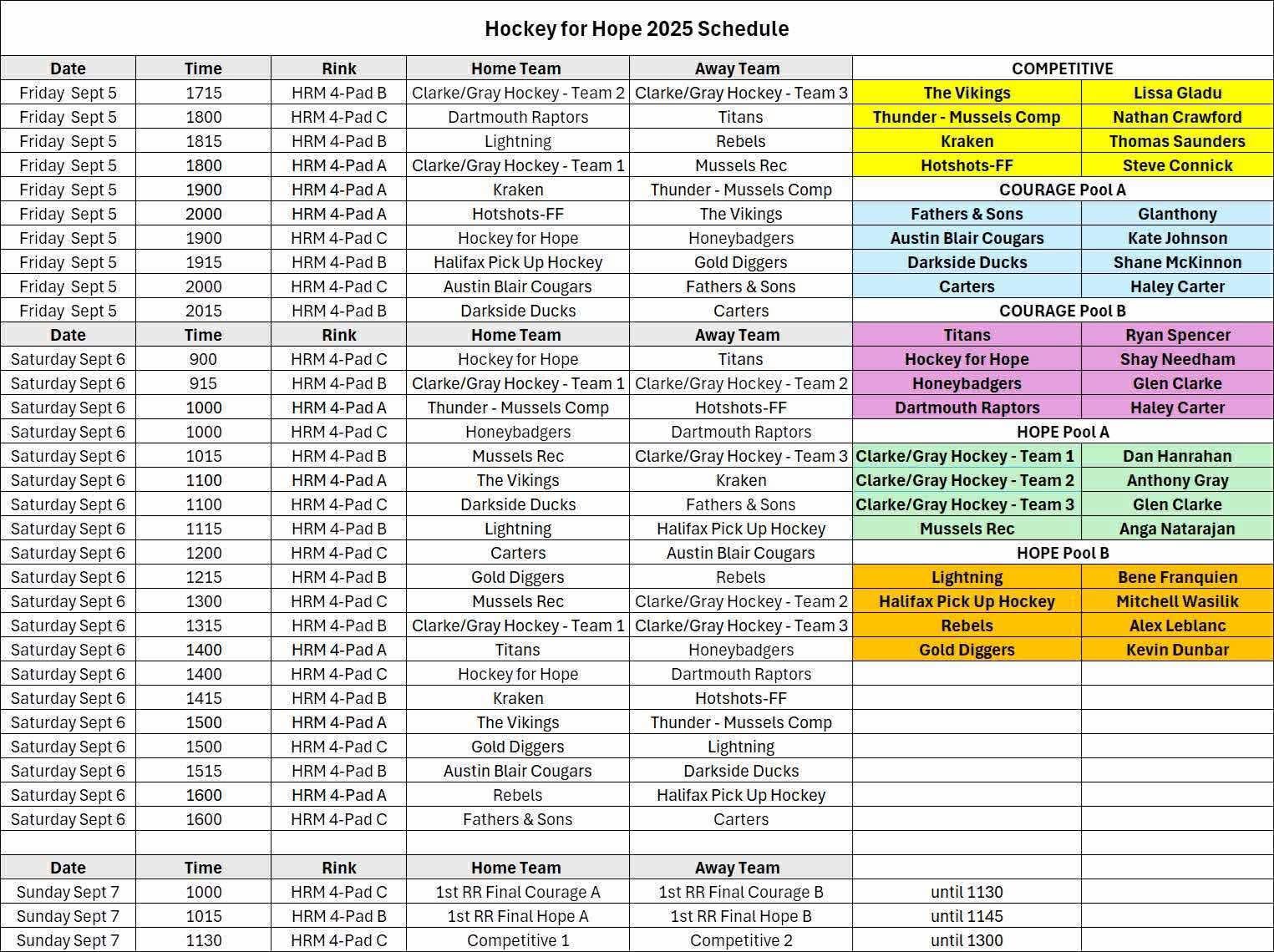Here are the teams and the schedule for the Hockey For Hope Tournament running Sept 5-7, 2025
